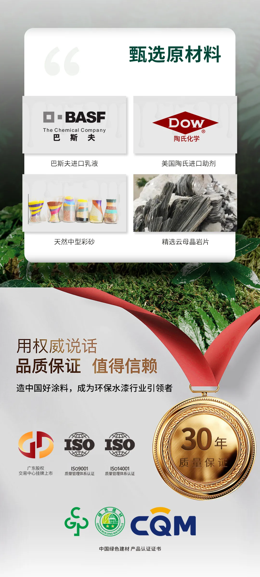 精選美國(guó)陶氏進(jìn)口助劑與巴斯夫德國(guó)進(jìn)口的優(yōu)質(zhì)硅丙聚合物乳液,有效提升荔晶石的整體品質(zhì),更在耐候性方面展現(xiàn)出非凡的優(yōu)越性。隨著時(shí)間的流逝愈發(fā)顯得經(jīng)典而不失光澤,保持色彩歷久彌新,始終如一。