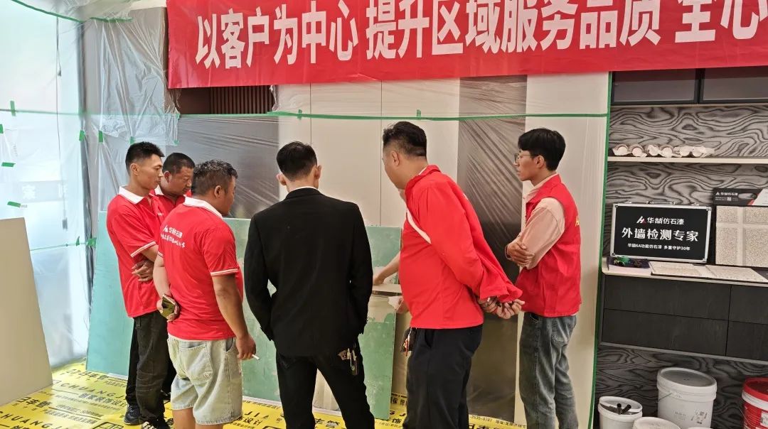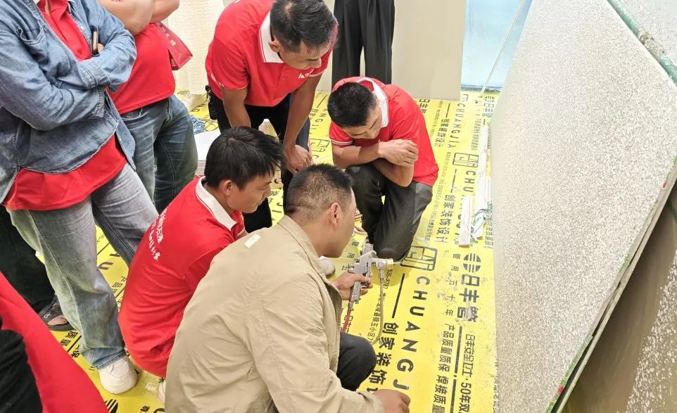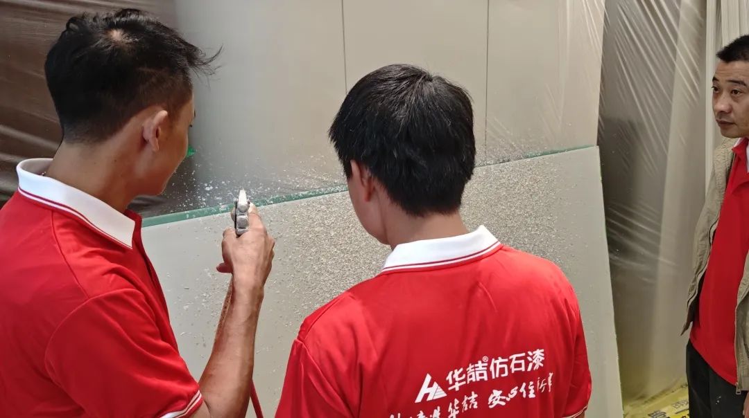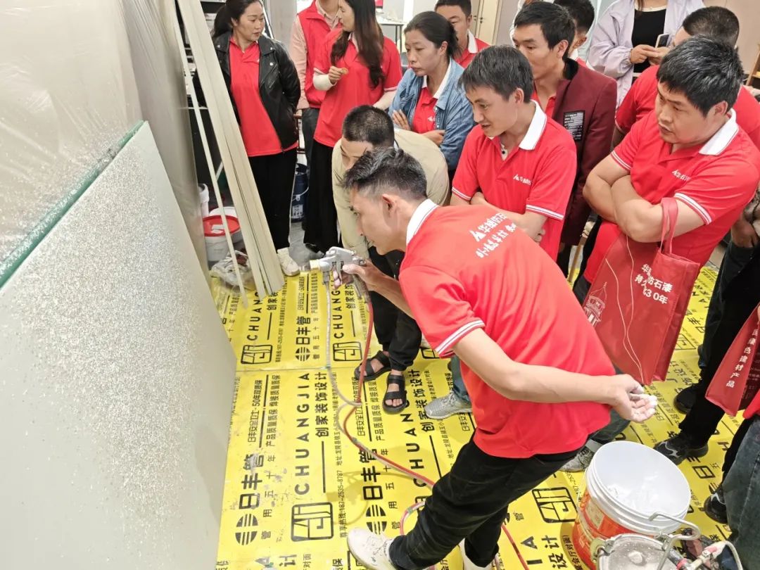 現(xiàn)場施工實(shí)操環(huán)節(jié),在華喆技術(shù)人員的指導(dǎo)下,油木工們親自上手,體驗(yàn)了仿石漆的實(shí)際施工過程。他們認(rèn)真操作,仔細(xì)琢磨,不僅加深了對施工工藝的理解,還提升了自身的實(shí)操能力?,F(xiàn)場氛圍熱烈而有序,每個(gè)人都沉浸在仿石漆的魅力之中。