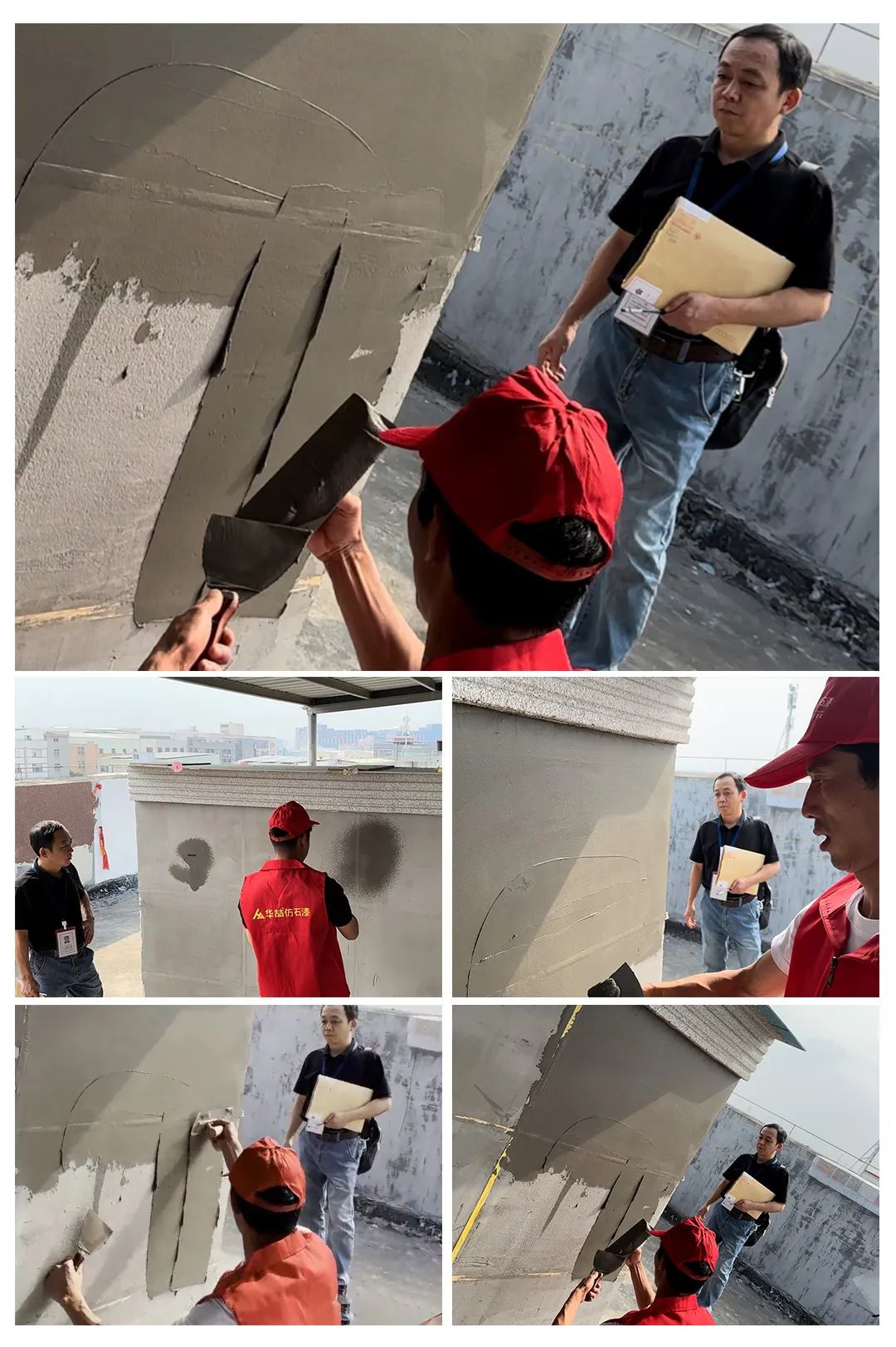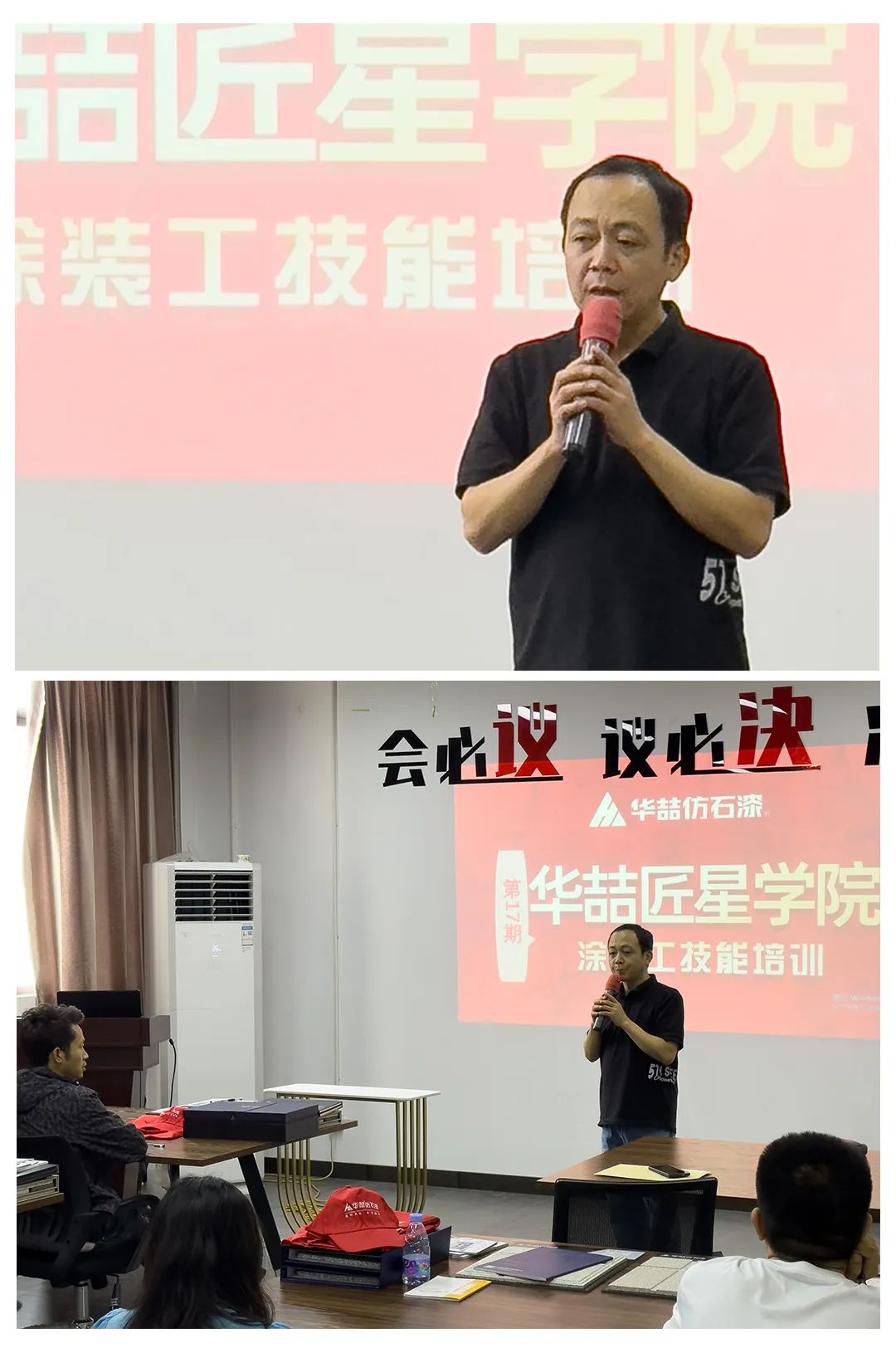 在匠星培訓(xùn)環(huán)節(jié)中,華喆技術(shù)領(lǐng)域的資深專家劉工,先為大家闡述仿石漆施工的理論知識(shí)。緊接著,他親自引領(lǐng)學(xué)員們邁入了實(shí)踐操作的全新階段。在劉工程師的專業(yè)細(xì)致指導(dǎo)下,學(xué)員們親自體驗(yàn)了仿石漆施工的每一個(gè)環(huán)節(jié),從周密的材料準(zhǔn)備到精湛的施工技巧,每一個(gè)細(xì)節(jié)都經(jīng)過(guò)了嚴(yán)格的磨練與實(shí)踐,確保每位學(xué)員都能全面而深入地掌握仿石漆施工的核心技術(shù)。